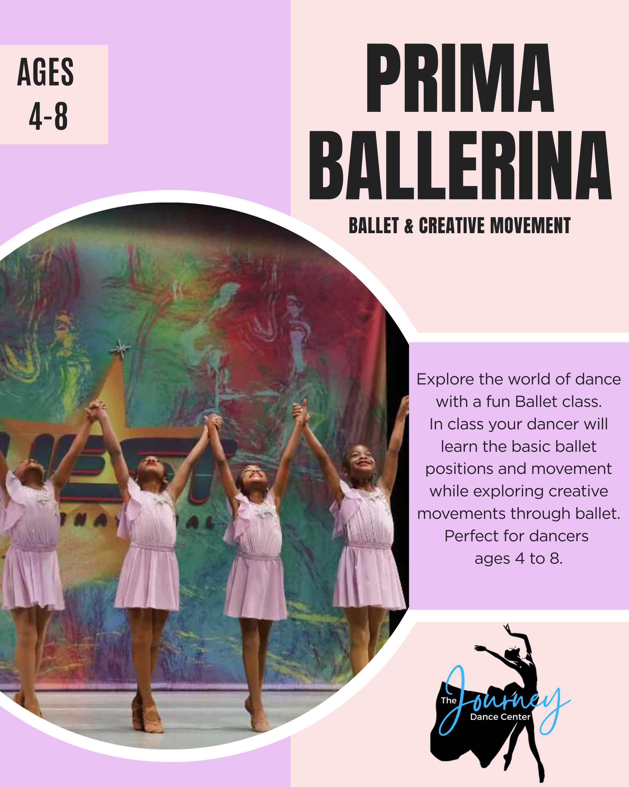 Explore the world of dance with a fun Ballerina Princess movement class. In class your dancer will learn the basic ballet positions and movement while exploring creative movements through ballet. Perfect for dancers ages 4 to 8.