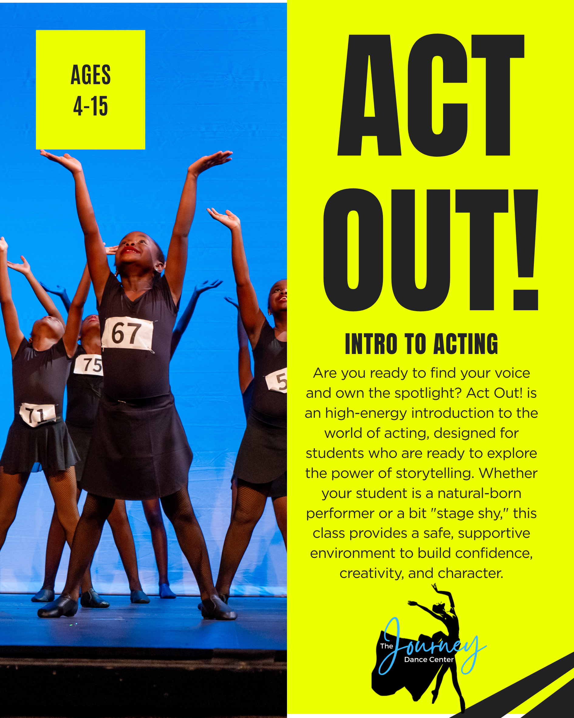 Are you ready to find your voice and own the spotlight? Act Out! is an high-energy introduction to the world of acting, designed for students who are ready to explore the power of storytelling. Whether your student is a natural-born performer or a bit "stage shy," this class provides a safe, supportive environment to build confidence, creativity, and character.