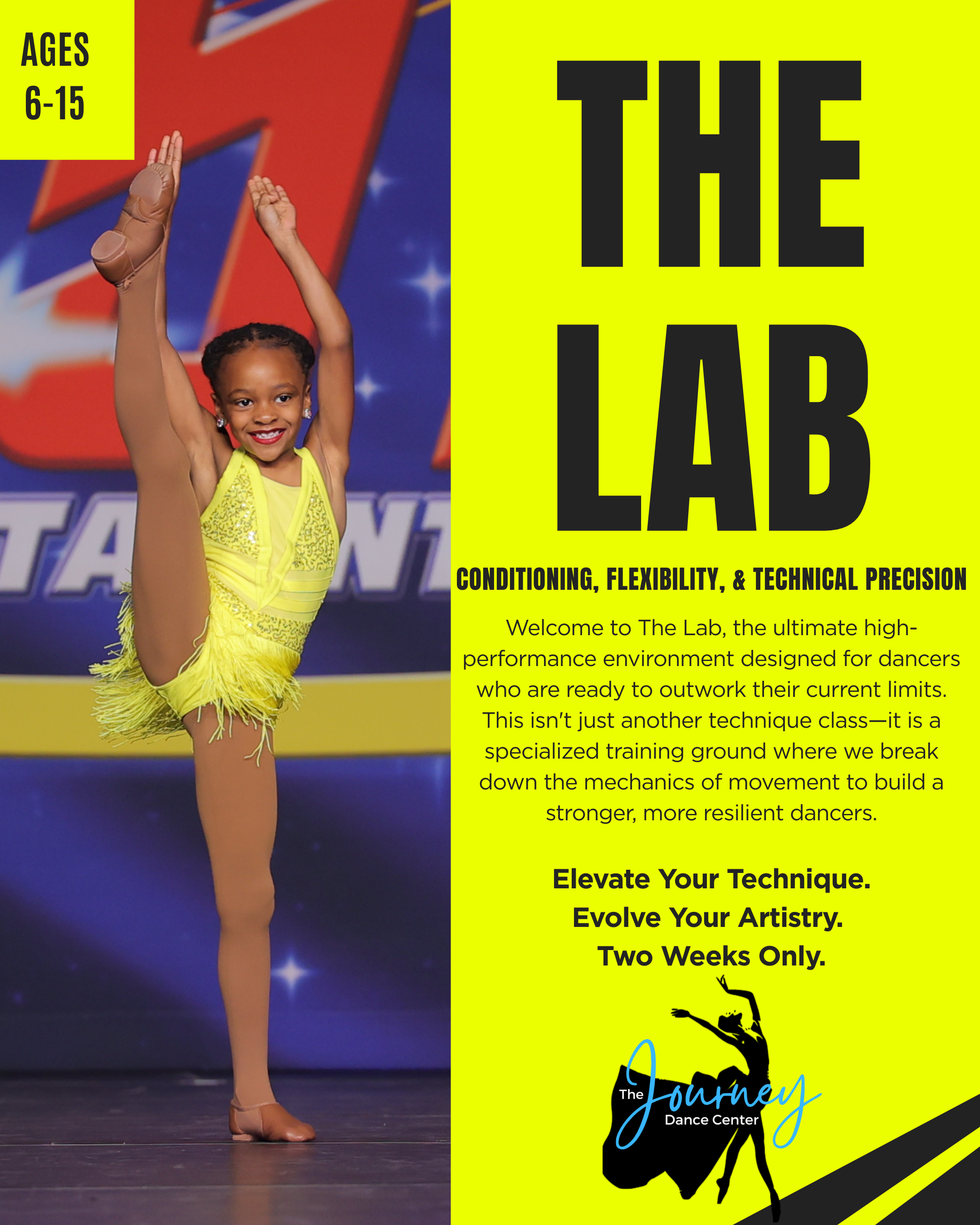 Welcome to The Lab, the ultimate high-performance environment designed for dancers who are ready to outwork their current limits. This isn't just another technique class—it is a specialized training ground where we break down the mechanics of movement to build a stronger, more resilient dancers. Focusing on Conditioning & Strength, Flexibility & Range of Motion, Technical Anatomy, and Advanced Elements. This class is a two week program.