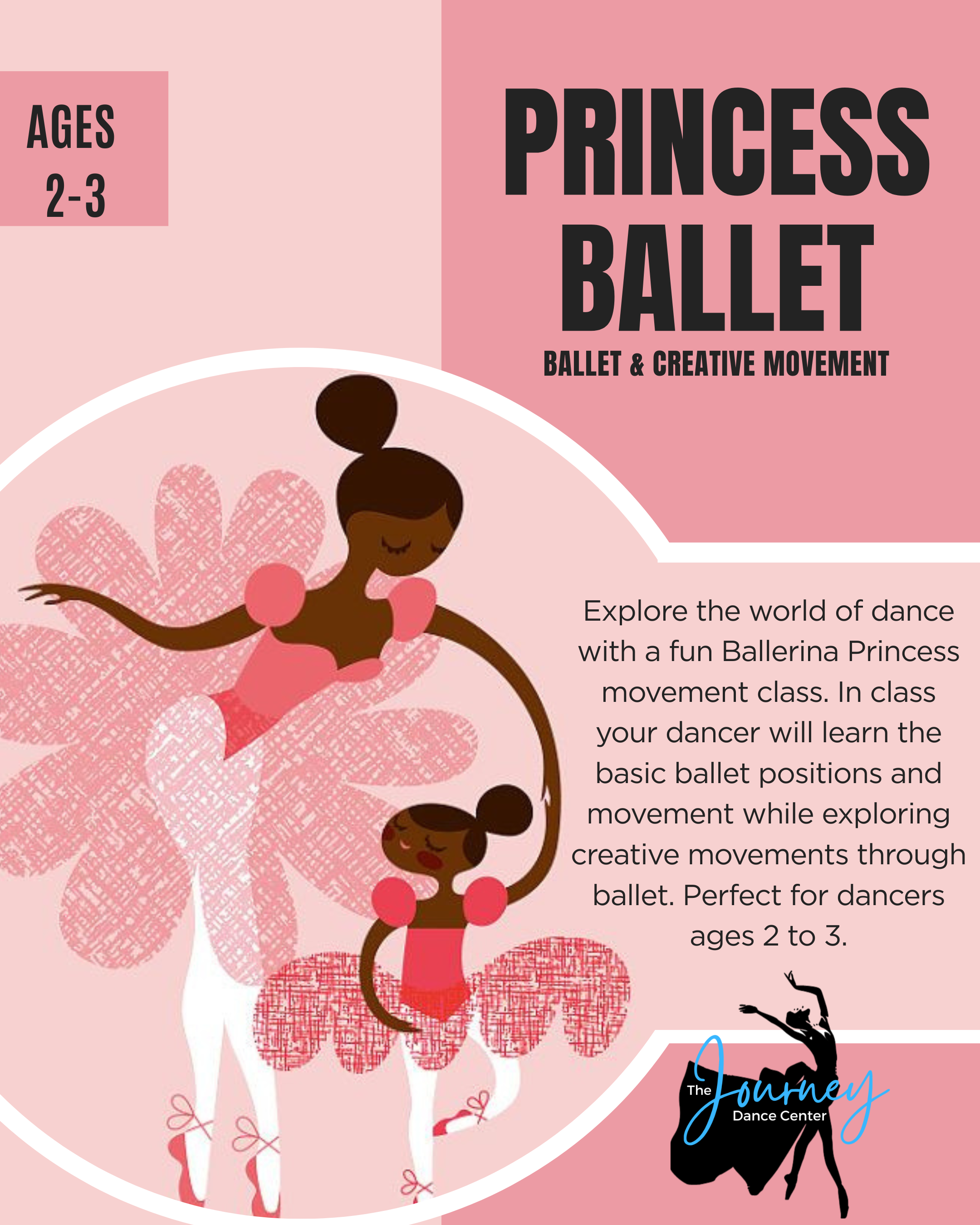 Explore the world of dance with a fun Ballerina Princess movement class. In class your dancer will learn the basic ballet positions and movement while exploring creative movements through ballet. Perfect for dancers ages 2 to 3.