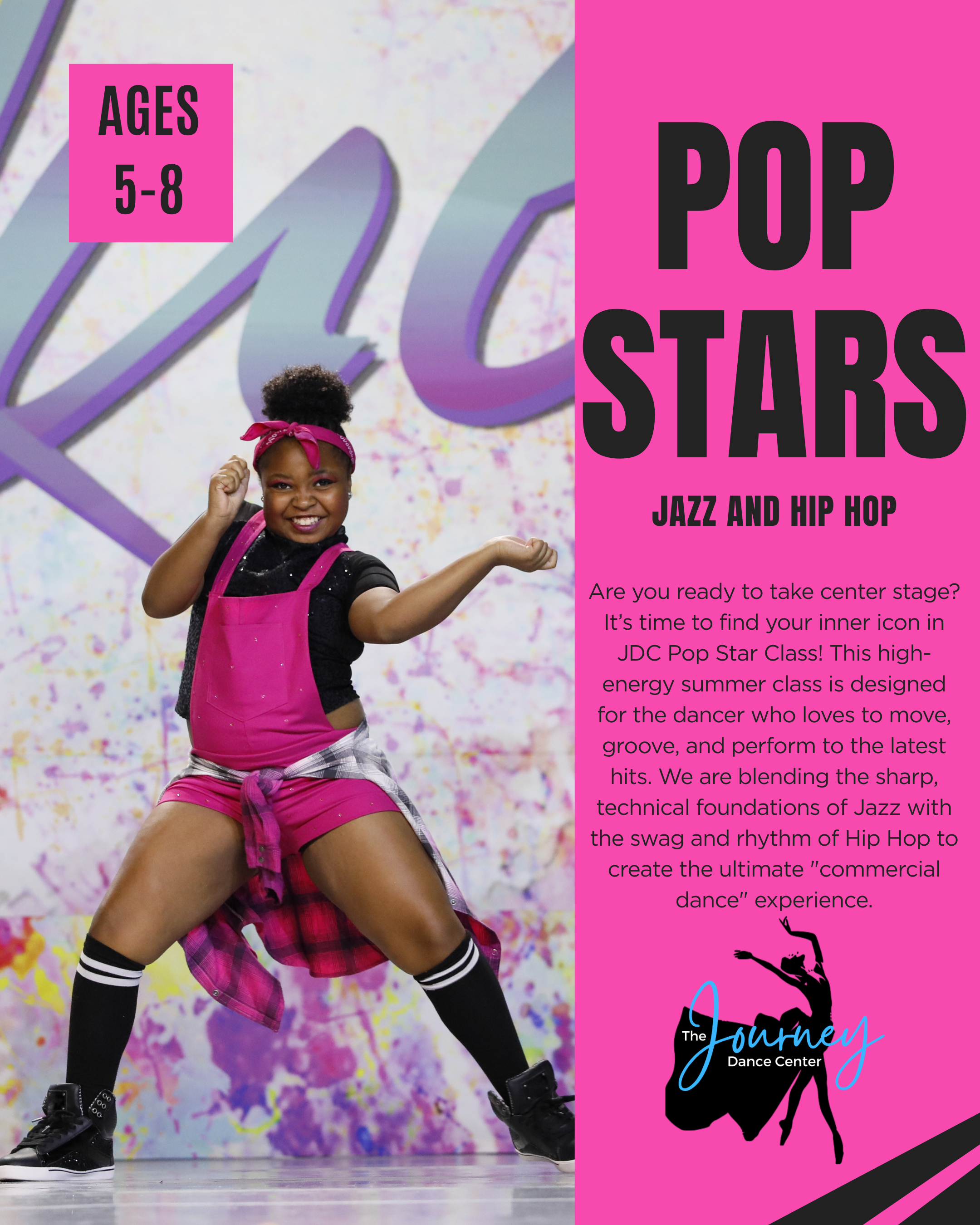 Are you ready to take center stage? It’s time to find your inner icon in JDC Pop Star Class! This high-energy summer class is designed for the dancer who loves to move, groove, and perform to the latest hits. We are blending the sharp, technical foundations of Jazz with the swag and rhythm of Hip Hop to create the ultimate "commercial dance" experience. Dancers will learn how to execute clean lines and sharp turns, while also finding their own unique style through fun, age-appropriate hip hop footwork and freestyle circles.